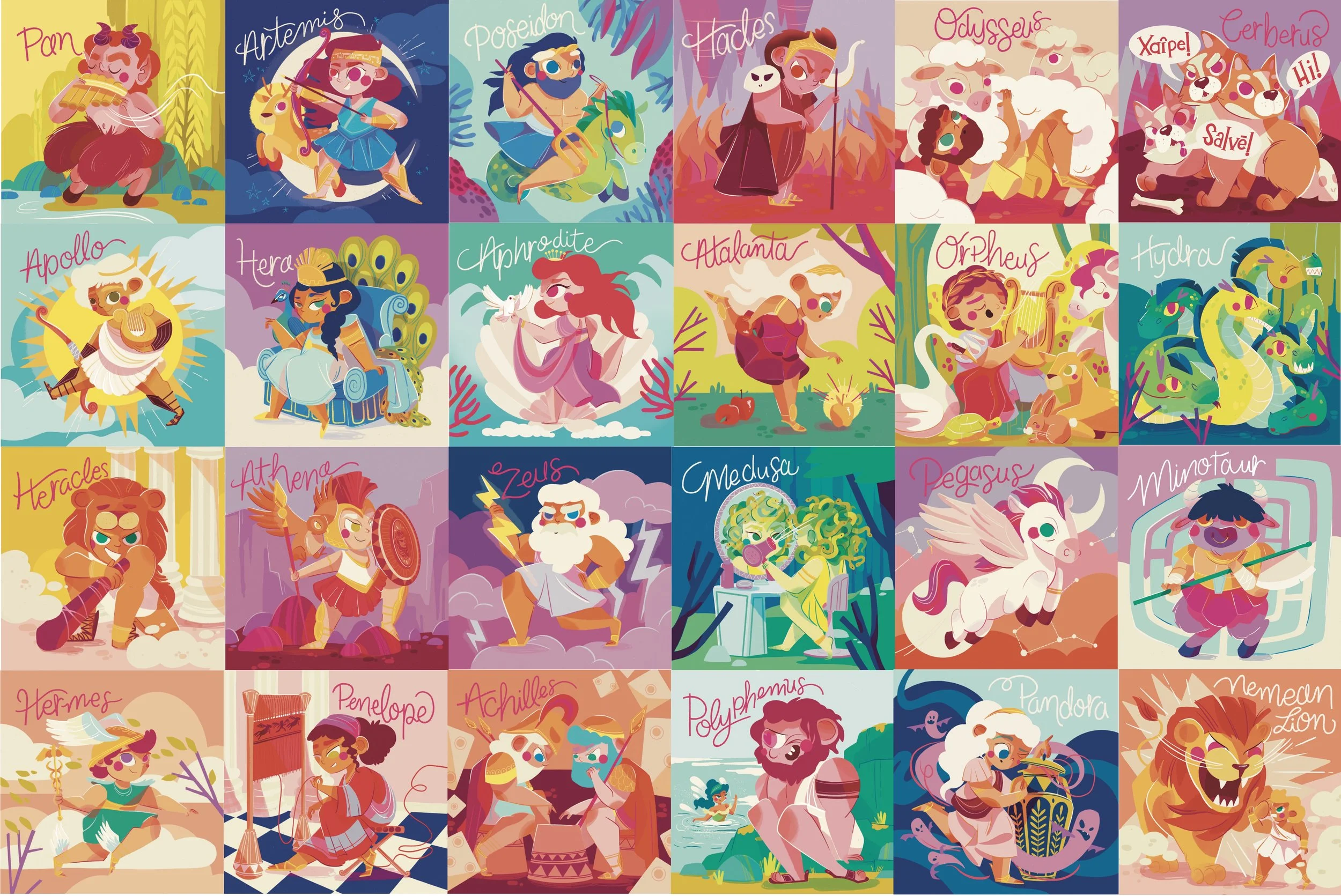 How I got connected to the project and started working with The Classical Workshop honestly felt like divine intervention. While mindlessly scrolling Instagram one day, an ad popped up looking for illustrators. Usually ads like this at best lead to crickets. But I found myself submitting a portfolio anyways, because why the heck not. Robert soon reached out with the dream project, create a set of 24 illustrations featuring Greek gods, heroes, and creatures for a matching game. He wanted accurate representations but other than that I was given complete creative freedom. I was already a fan of Greek mythology thanks to Disney’s Hercules (I wanted to be Meg so bad! “I’m a damsel, I’m in distress, I can handle this.”) and other more recent media like Hadestown and Lore Olympus had me captivated. So it’s safe to say, I was in.