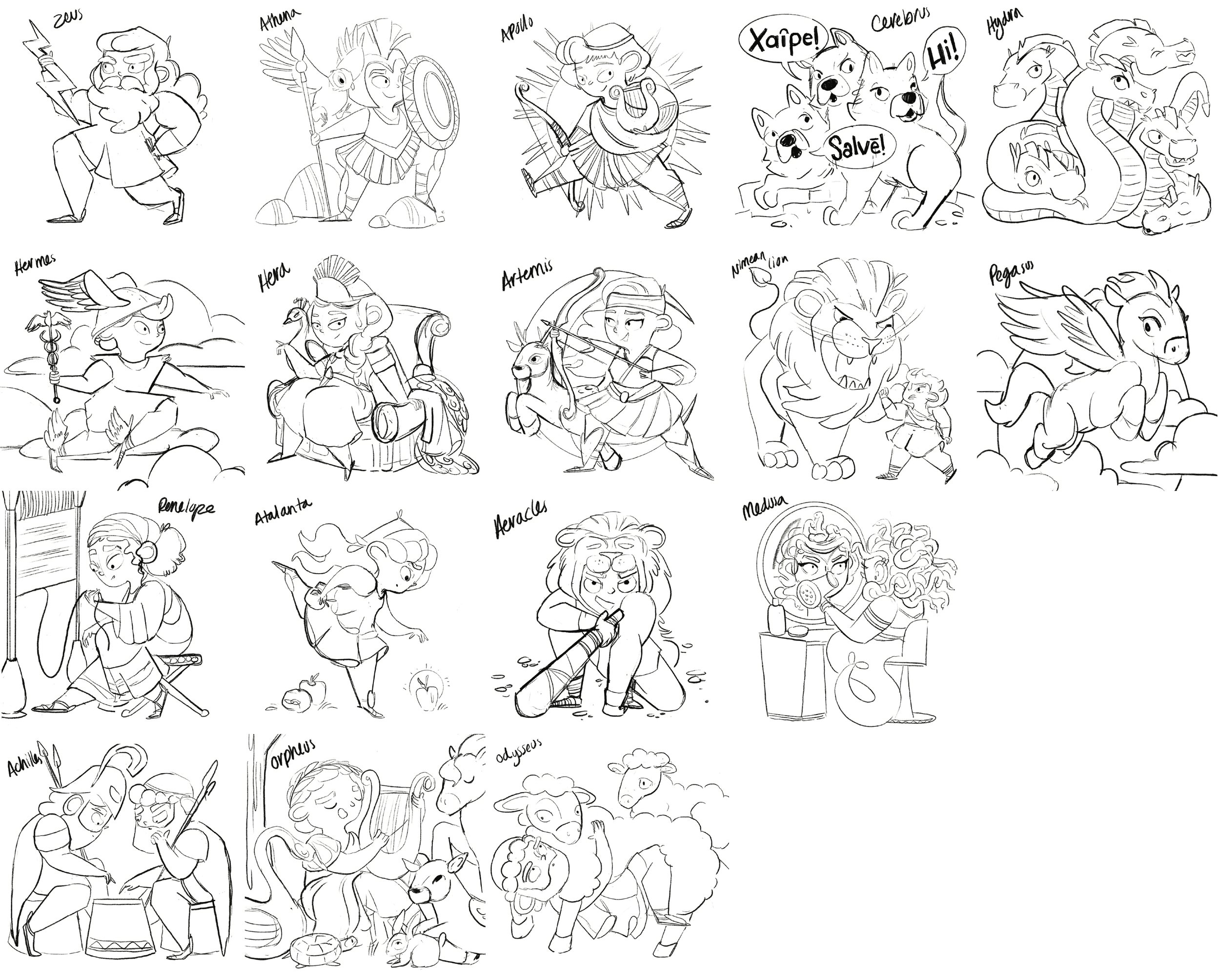 Robert supplied me with a list of figures to draw so the hard work of narrowing down all of Greek mythology to 24 characters was already done for me. I started by compiling reference photos of each figure. Since we wanted these to be in line with how they were historically portrayed, I tried to find images of classic sculptures for my main references. I was specifically looking at how their clothes were commonly portrayed and common stances they’re seen in.